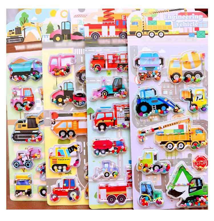 水入りシャカシャカステッカー 全4種類セット 働く車 工事車両 消防車 乗り物 男の子 ご褒美シール 立体バブル